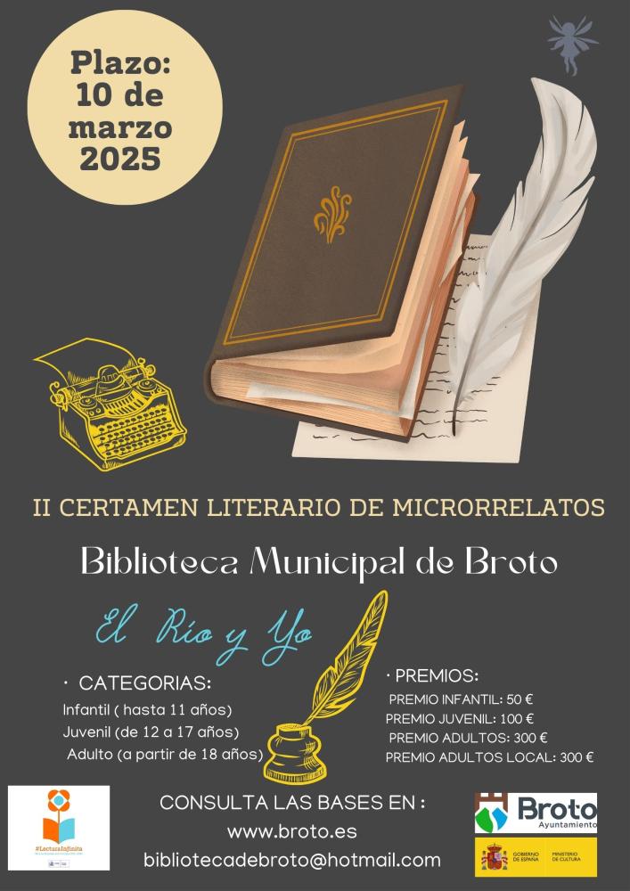 II Certamen literario de microrrelatos Whatsapp: II Certamen literario de microrrelatos Fecha 30 enero 2025 El Río y Yo Adjuntamos cartel y bases del II Certamen literario de microrrelatos de la Biblioteca Municipal de Broto Documentos BASES MICRORRELATOS BROTO .pdf (pdf 149,8 kB) Galería imágenes
