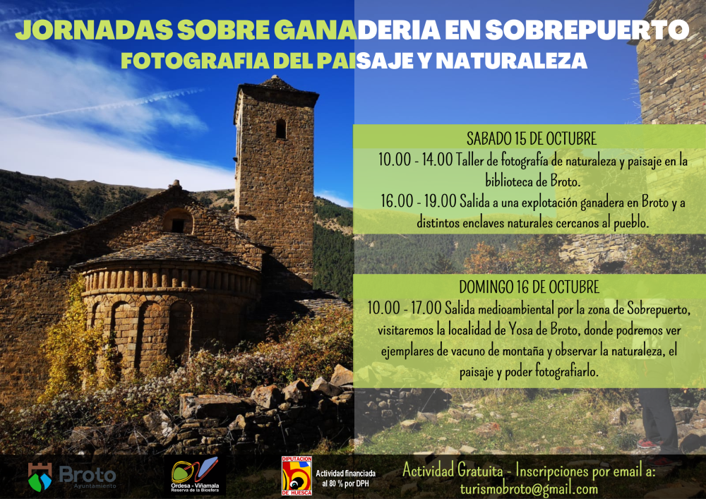 10:00-17:00 horas: Salida medio ambiental por la zona de Sobrepuerto, visitaremos la localidad de Yosa de Broto, donde podremos ver ejemplares de vacuno de montaña y observar la naturaleza, el paisaje y poder fotografiarlo.