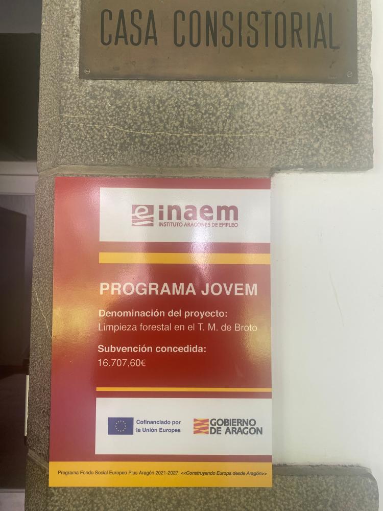 El ayuntamiento de Broto solicitó al INAEM una subvención para contratación de una persona desempleada e inscrita en el sistema de Garantía Juvenil para su participación en el proyecto de interes general y social denominado Limpieza Forestal. Esta solicitud fue resuelta de manera favorable. A partir del día 22 de junio de 2023, y por el plazo de 10 meses el ayuntamiento de Broto contará con una persona contratada con categoría de Peón Forestal.